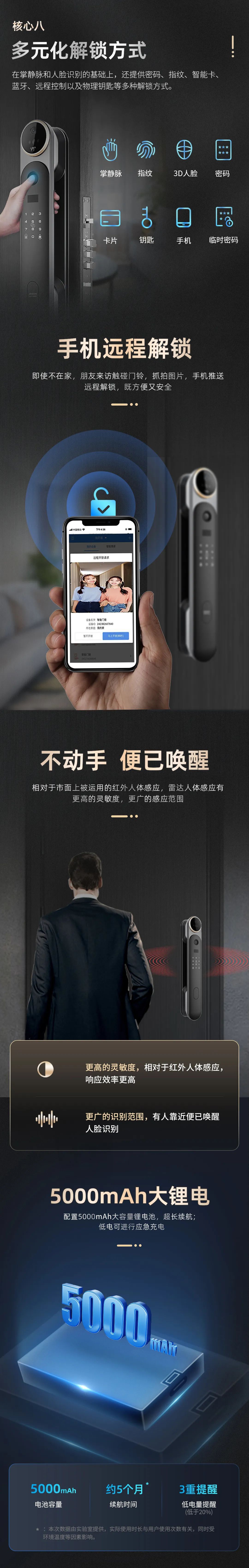 掌静脉智能门锁的另一个显著优势在于其便捷性。用户无需携带钥匙或记住复杂的密码,只需将手掌轻轻放置在门锁的识别区域,即可完成身份验证并开启门锁。这种无缝的接入方式不仅简化了用户的使用流程,也大大提高了家居生活的便捷性。