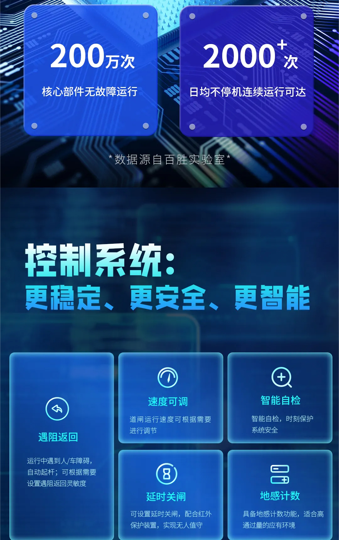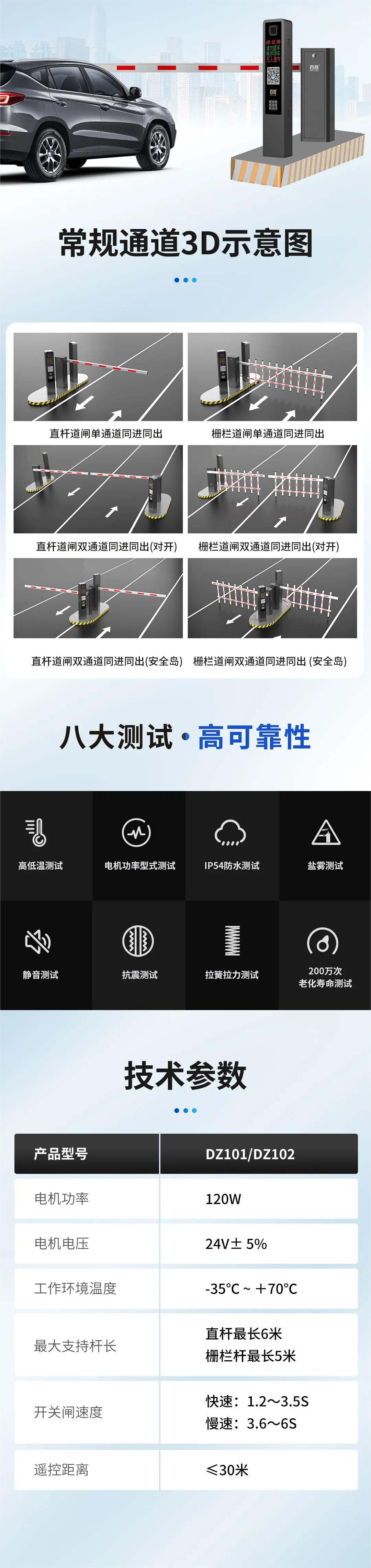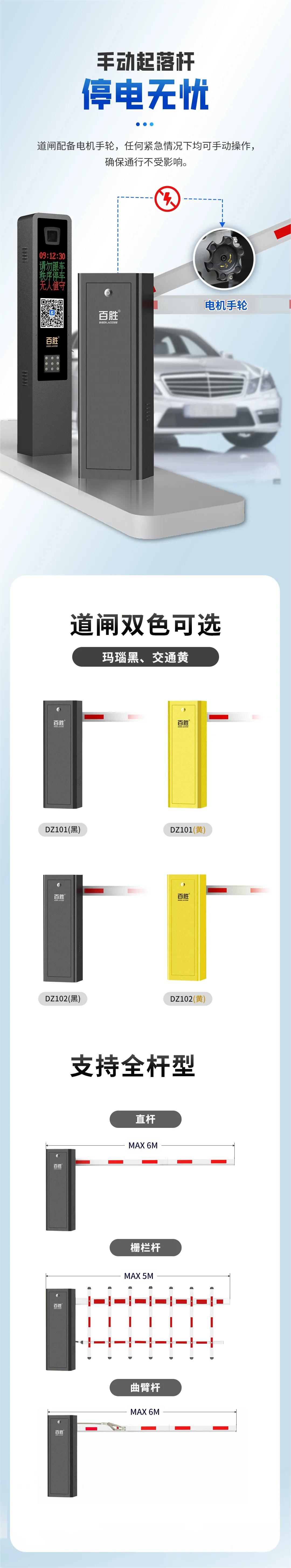 百胜DZ101、DZ102直流无刷道闸标配120W无刷机芯,提供平稳、强劲动力的同时道闸运行更平稳、更省电。快速起杆、慢速落杆,软启动、软停止,运行更平稳、安全;运行速度1.2-3.5S、3.6-6S可调,适应于不同场景对道闸运行速度的要求。