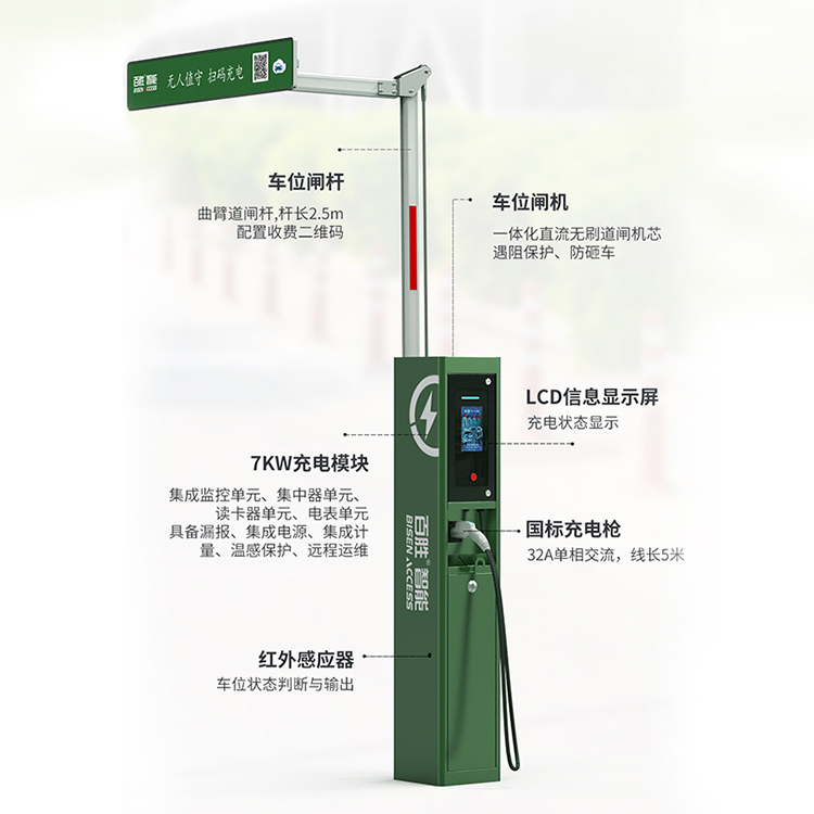 7KW交流充电桩,集充电车位管理功能于一体,无人值守管理,自动收费远程,满足运营管理、有序充电、实时监控、订单管理、财务报表、移动支付等需求。
